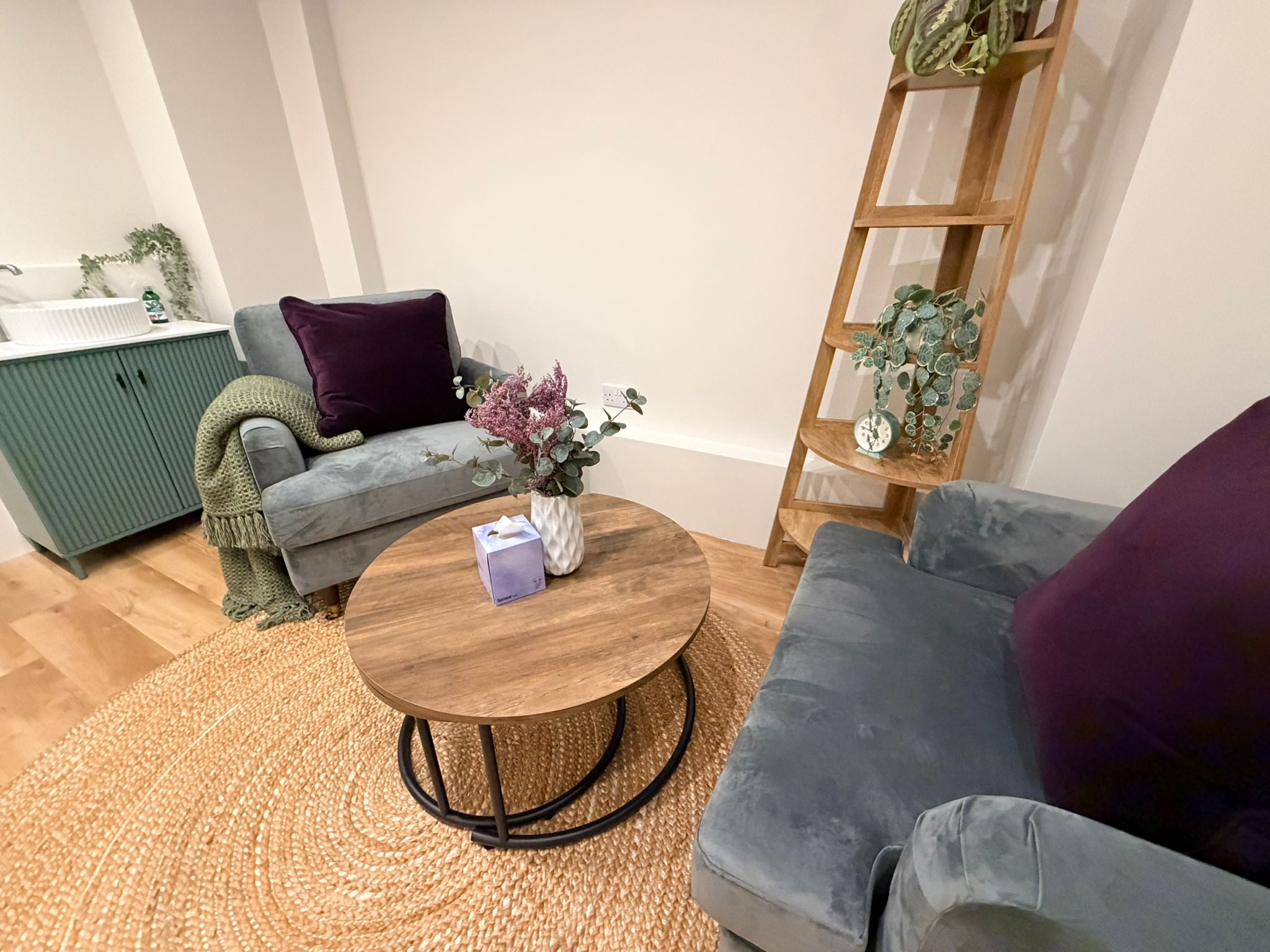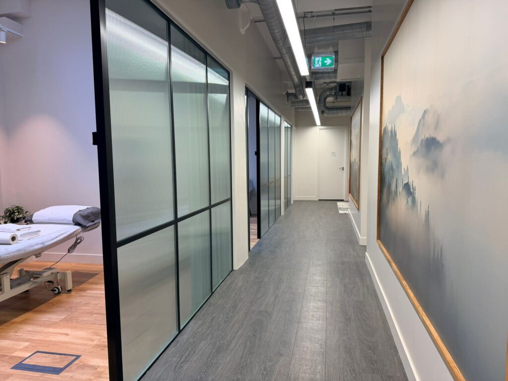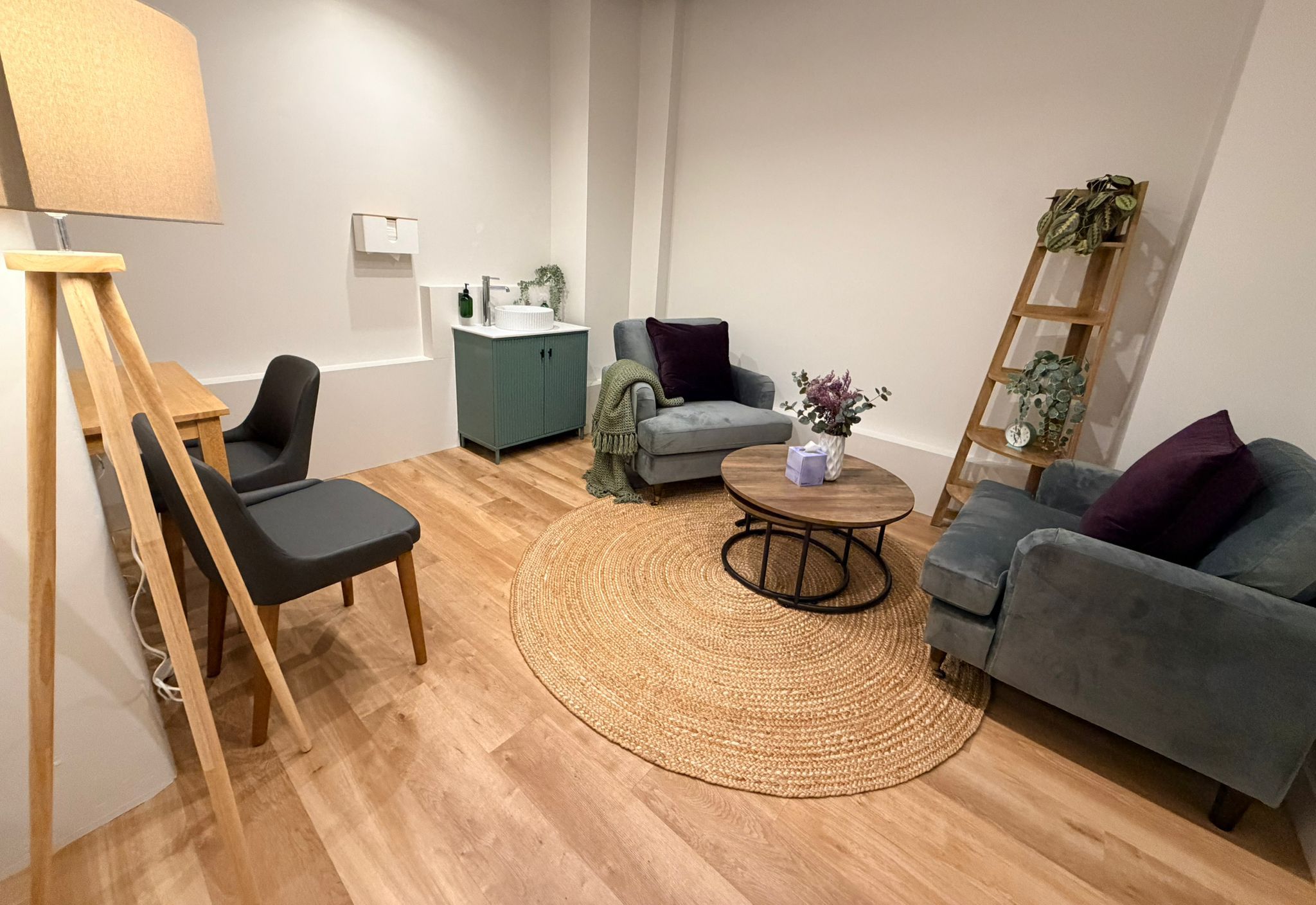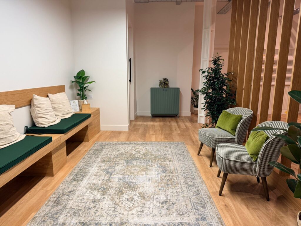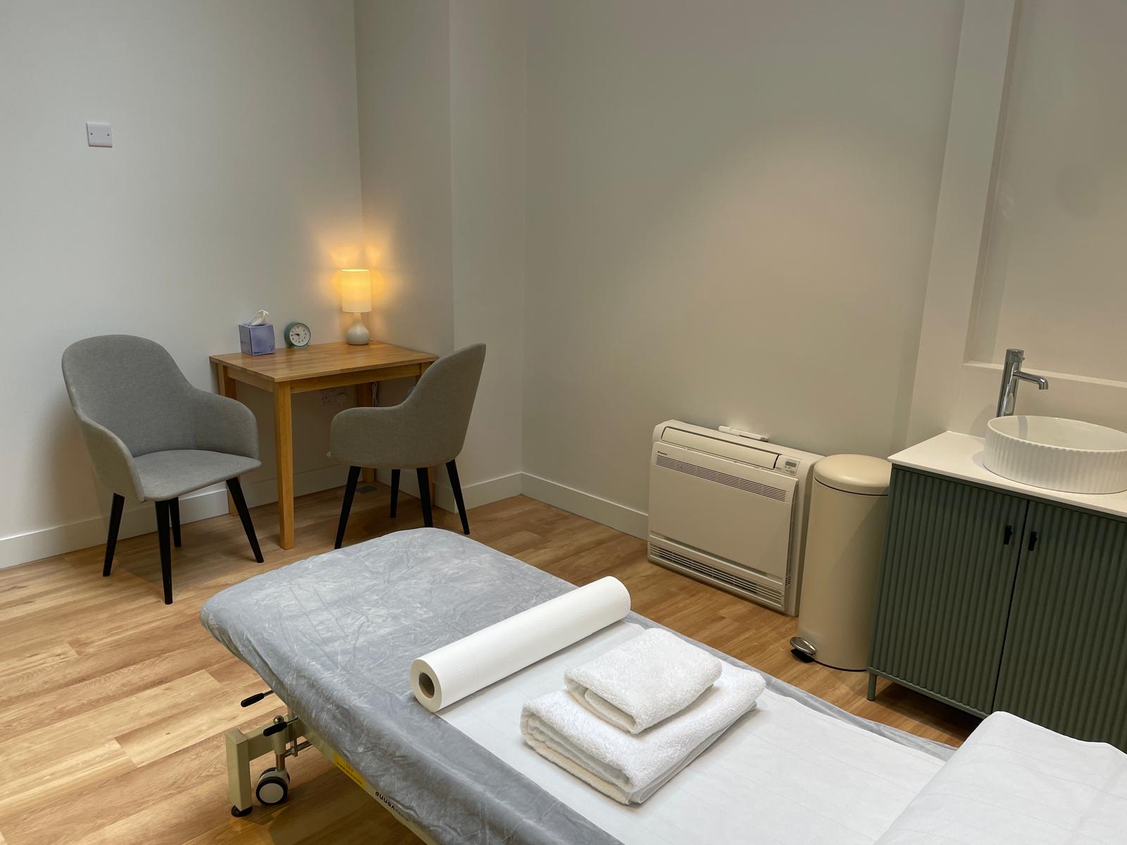 All good-sized treatment rooms, modern, bright and airy. All with natural light, sink, desk, 2 chairs and therapy Plynth couch. All with a contemporary and welcoming feel. Dedicated Talking Therapy rooms as well as dedicated Physical Therapy rooms.