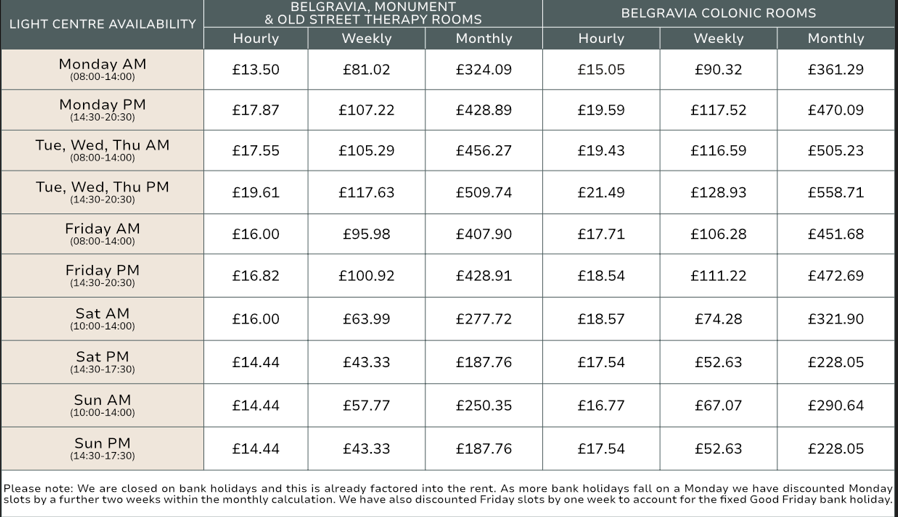 The therapy rooms are starting from £14.52 per hour for a 6-hour slot (NO VAT) and they are ALL INCLUSIVE of bills, utilities, clean towels, access 7 days a week with receptionist and business rates are included too. We also include marketing support and a storage box. From £348.48pcm all-inclusive of marketing support and storage box.